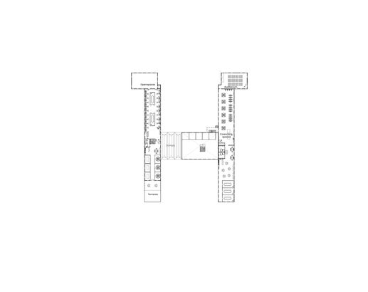 To turn this hinge into a focal point where people not only stop by but also come back to it or stay there, we decided to implant a social and cultural hub into the existing concrete building. This was a former military building of 7 floors of 1975. The new place accomodates a covered marketplace and street, a food hall with a café and rooftop, some venues and seasonal temporary spaces to host events, workshops, rentable classes and offices, co-working and openspaces, study rooms and a library, and finally, some student appartments/rooms. The different areas were located and designed according to intimacy levels and sunlight needs, as well as depending on the new public space.