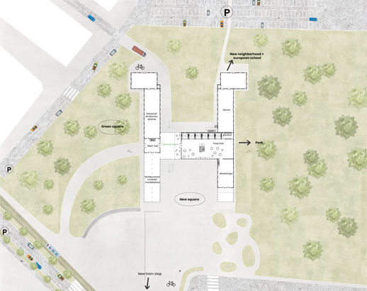 Indeed, the project also includes a redesigned main street with a new tramway line, less space given to cars, only 2 lanes and street parking to add some pedestrian and bicycle ways as well as green lanes. A new square was added to create a space for events, markets and activities, and green areas, each being a different type of "green" : from wild parks on the East side to more urban parks with paths and leisure areas on the street side, connected to the square. The building is now crossable thanks to the street, allowing a smoother connection between the north and the south parts of this neighborhood.